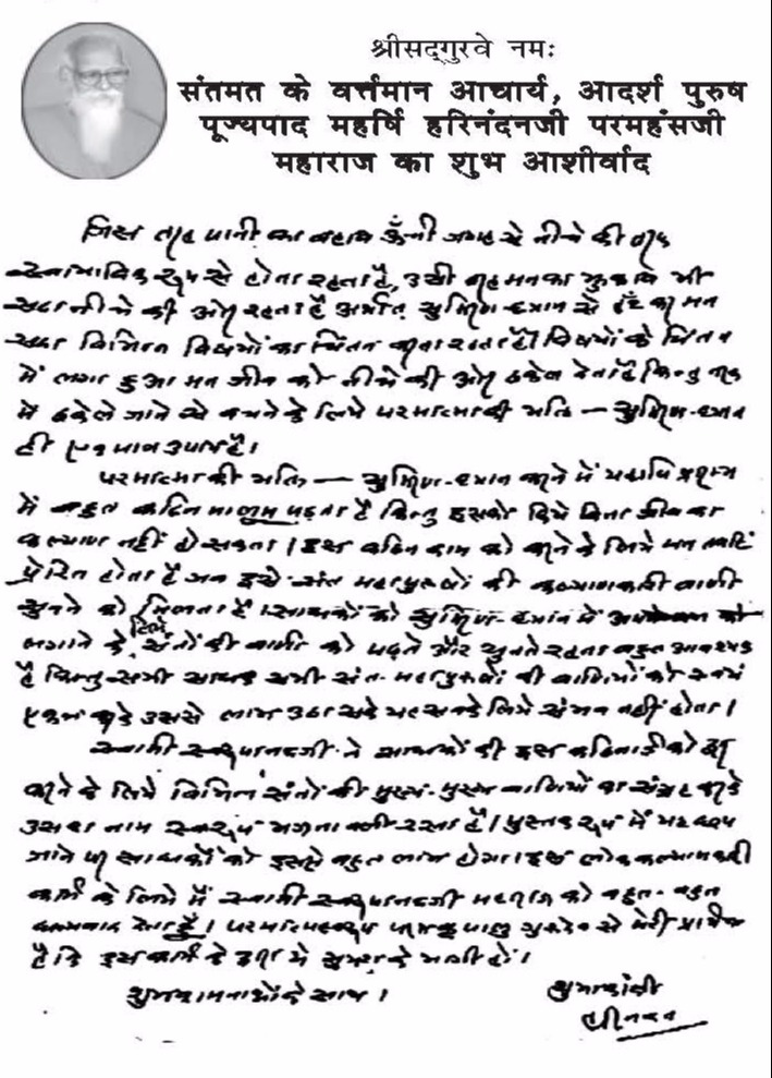 संतमत के वर्त्तमान आचार्य, आदर्श पुरुष पूज्यपाद महर्षि हरिनंदनजी परमहंसजी महाराज का शुभ आशीर्वाद